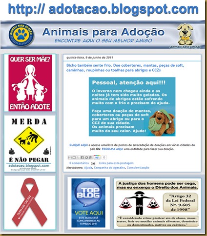 Mas a divulgação de um blog que tem como único objetivo divulgar as centenas de e-mails que recebe das protetoras para divulgar os animais que esperam a chance de encontrar adotantes, pode ser a diferença entre ser adotado ou passar a vida inteira a espera de uma família, ou um tutor que lhe de o carinho, o respeito e a posse responsável que eles merecem.